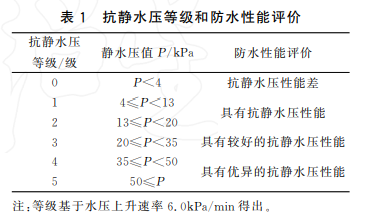 靜態(tài)防水性能是指沖鋒衣抵御雨水浸濕滲透的能力。這是沖鋒衣最基礎的功能,可以有效防止雨雪浸入衣服。這一項可以通過量化實驗檢查——對織物一面施加一個持續(xù)上升的水柱,直到另一面出現(xiàn)三處滲水點,此時去水柱水壓值??轨o水壓等級和防水性能評價表見下圖