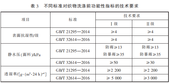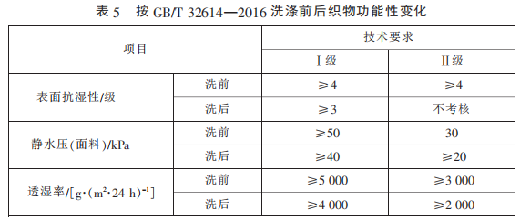 考慮到防水透濕面料功能的 耐用性,GB/T 32614—2016 中增加 了對功能性指標(biāo)的洗后測試,采用 標(biāo)準 GB/T 8629—2001《紡織品 試 驗用家庭洗滌和干燥程序》 中 的 5A 程 序 洗 滌 3 次 并 懸 掛 晾 干,洗 后的指標(biāo)要求變化具體見表 5,相 較于洗前,指標(biāo)略有降低。