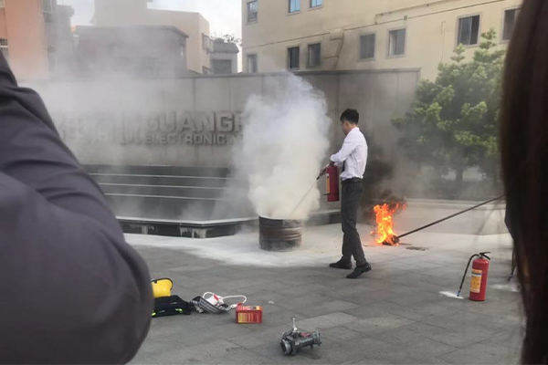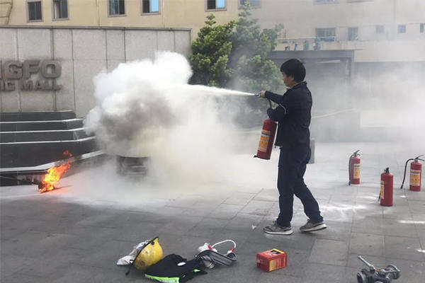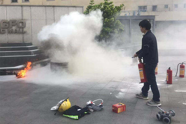 6.在距離火焰兩米的地方,右手用力壓下壓把,左手拿著噴管左右擺動,噴射干粉覆蓋整個(gè)燃燒區(qū)