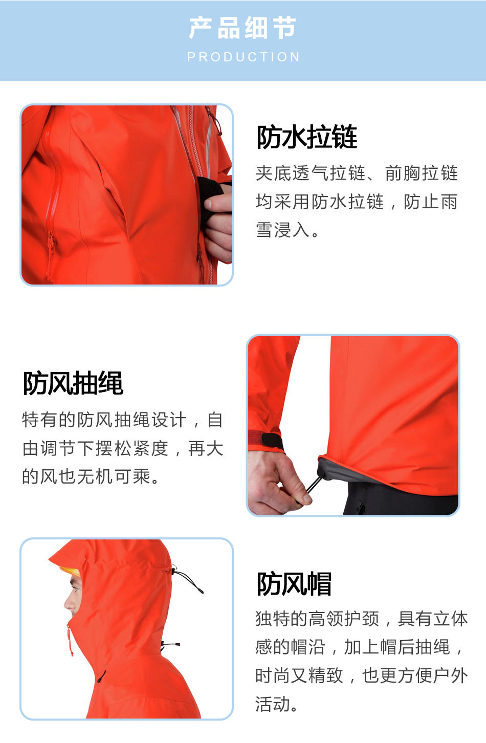 防風帽:獨特的高領(lǐng)護頸,具有立體感的帽沿,加上帽后抽繩,時尚又精致,也更方便戶外活動。