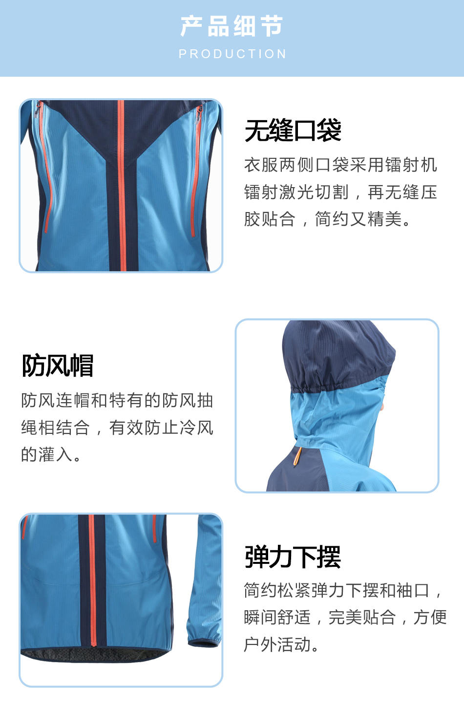 防風(fēng)帽:單層壓膠沖鋒衣的防風(fēng)連帽和特有的防風(fēng)抽繩相結(jié)合,有效防止冷風(fēng)的灌入。