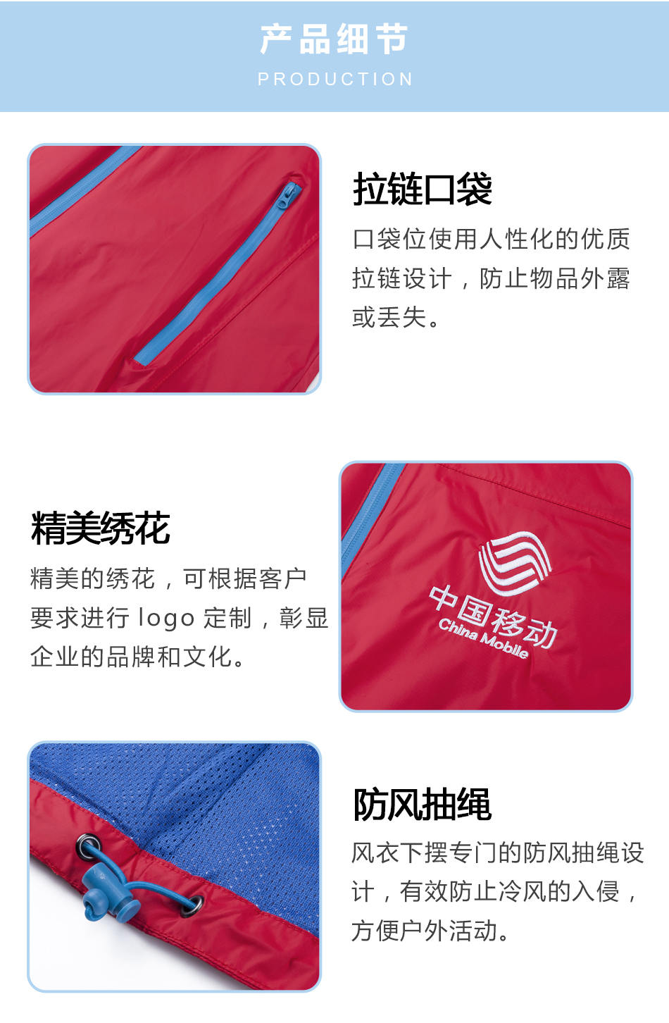 • 精美繡花:精美的繡花,可根據(jù)客戶要求單層風(fēng)衣定制的logo設(shè)計,彰顯企業(yè)的品牌和文化。