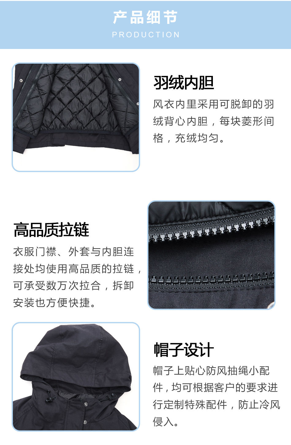 帽子設(shè)計:帽子上貼心防風(fēng)抽繩小配件,均可根據(jù)客戶的要求進(jìn)行戶外風(fēng)衣套裝定制其特殊配件,防止冷風(fēng)侵入。