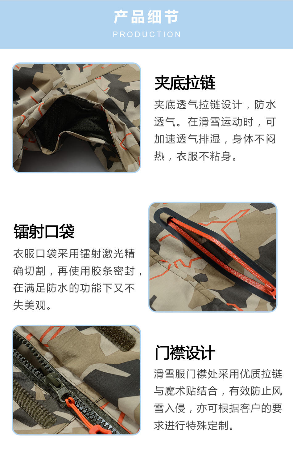 門襟設(shè)計(jì):滑雪服門襟處采用優(yōu)質(zhì)拉鏈與魔術(shù)貼結(jié)合,有效防止風(fēng)雪入侵,亦可根據(jù)客戶的要求進(jìn)行特殊定制。