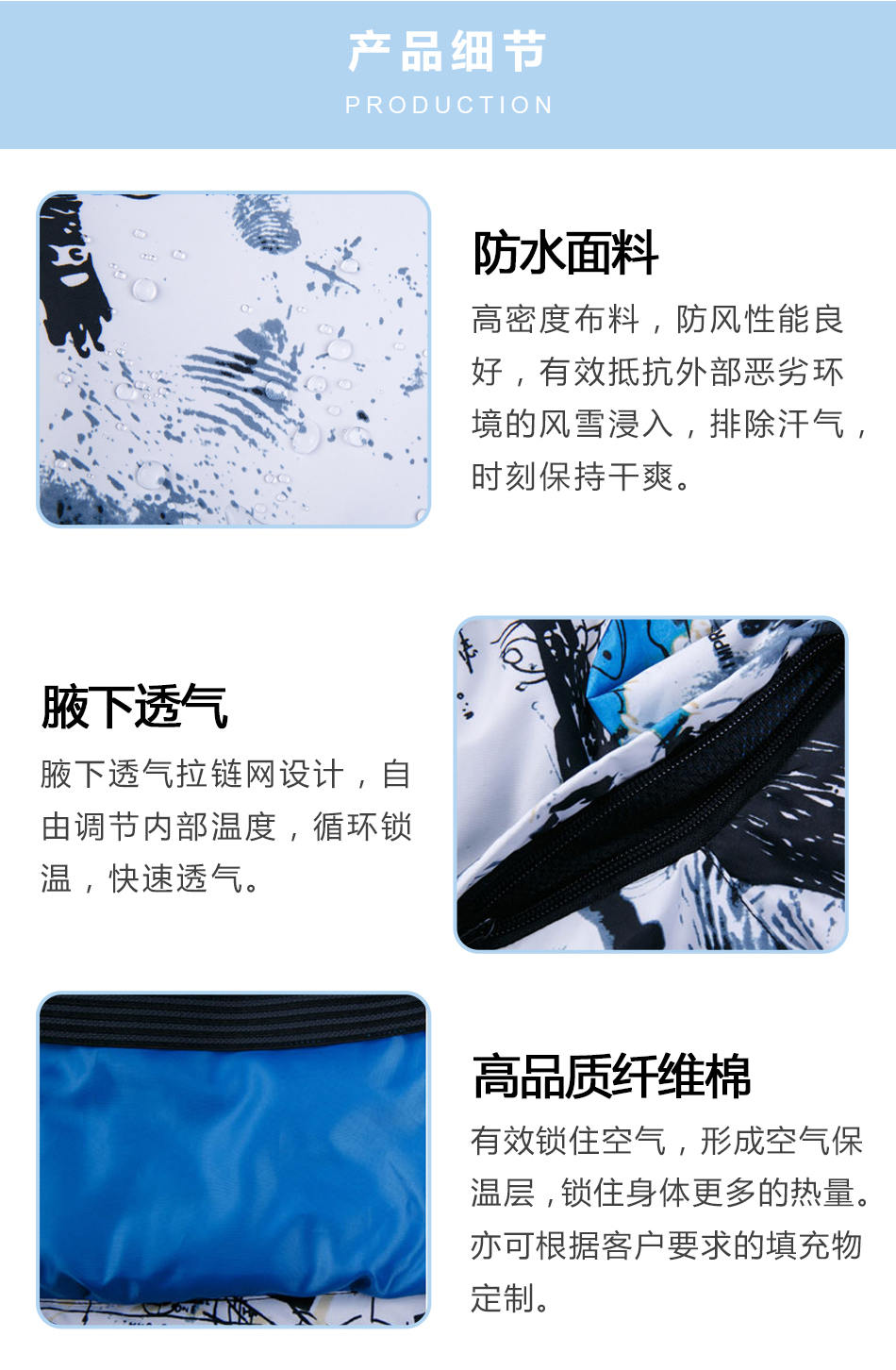 • 高品質(zhì)纖維棉:有效鎖住空氣,形成空氣保溫層,鎖住身體更多的熱量。亦可根據(jù)客戶要求的填充物進(jìn)行保暖滑雪服定制