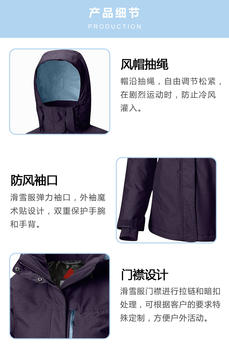 門襟處理滑雪服生產(chǎn)的門襟進(jìn)行拉鏈和暗扣處理,可根據(jù)客戶的要求特殊定制,方便戶外活動(dòng)。