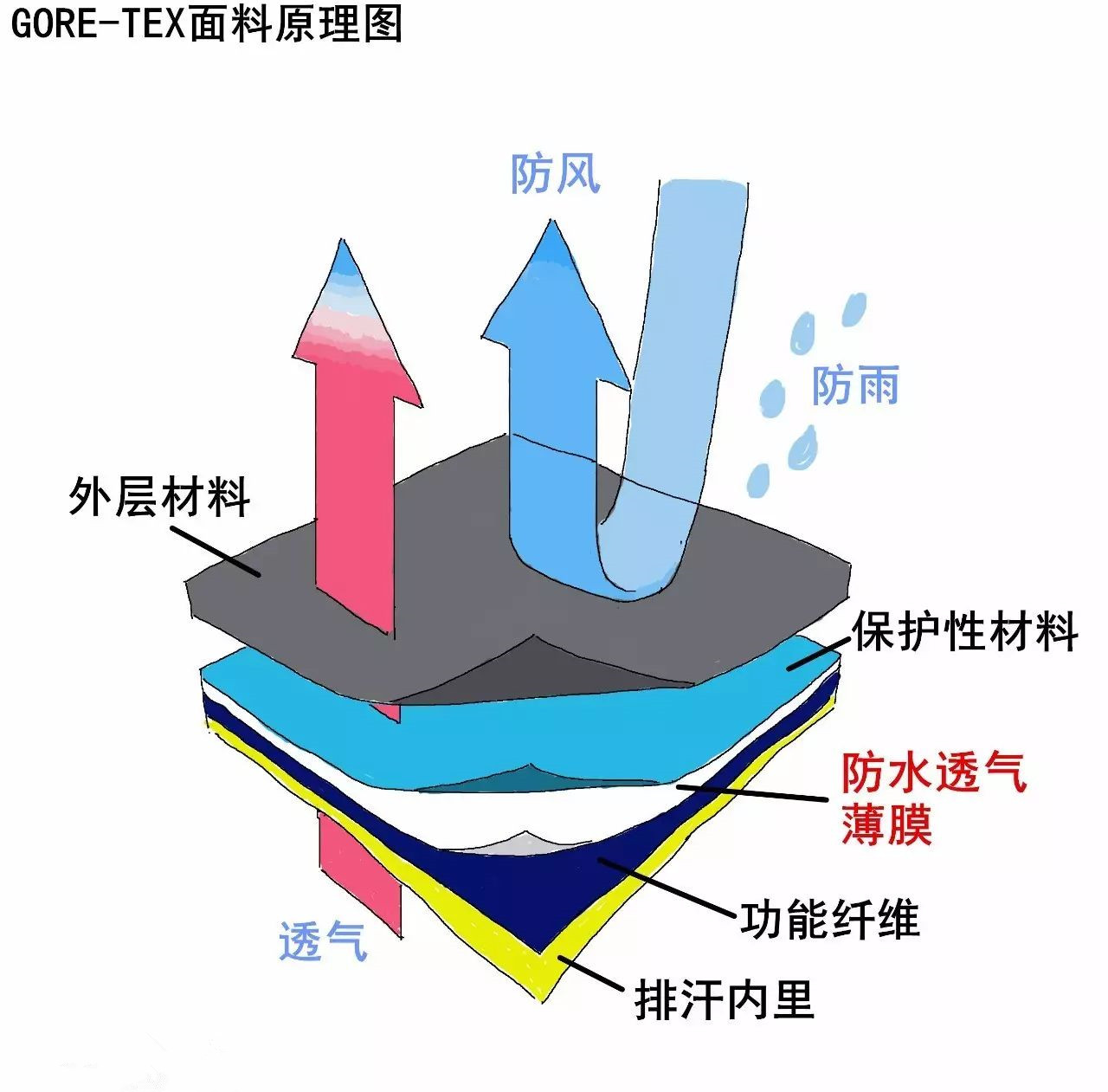 戈?duì)柼厮?Gore-Tex)面料原理示意。