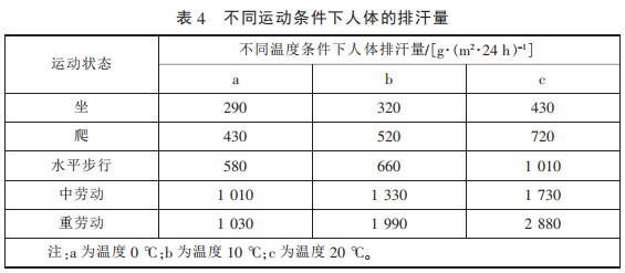 GB/T 32614—2016 中 功 能 性 指 標(biāo)(洗 前)與 GB/T 21295—2014 《服裝理化性能的技術(shù)要求》對比 可知,GB/T 32614—2016 中對于拒 水、耐靜水壓和透濕率 3 項功能性 要求更高,尤其是Ⅰ類產(chǎn)品的耐靜 水壓和透濕率遠高于 GB/T 21295— 2014 的技術(shù)要求。兩標(biāo)準對這 3 項 性能要求對比見 表 3。 滿 足 GB/T 32614—2016 的沖鋒衣可以抵擋暴 雨的沖擊,也滿足登山、攀巖等大 運動量下的透濕要求,不同條件下 人體的排汗量見表 4。