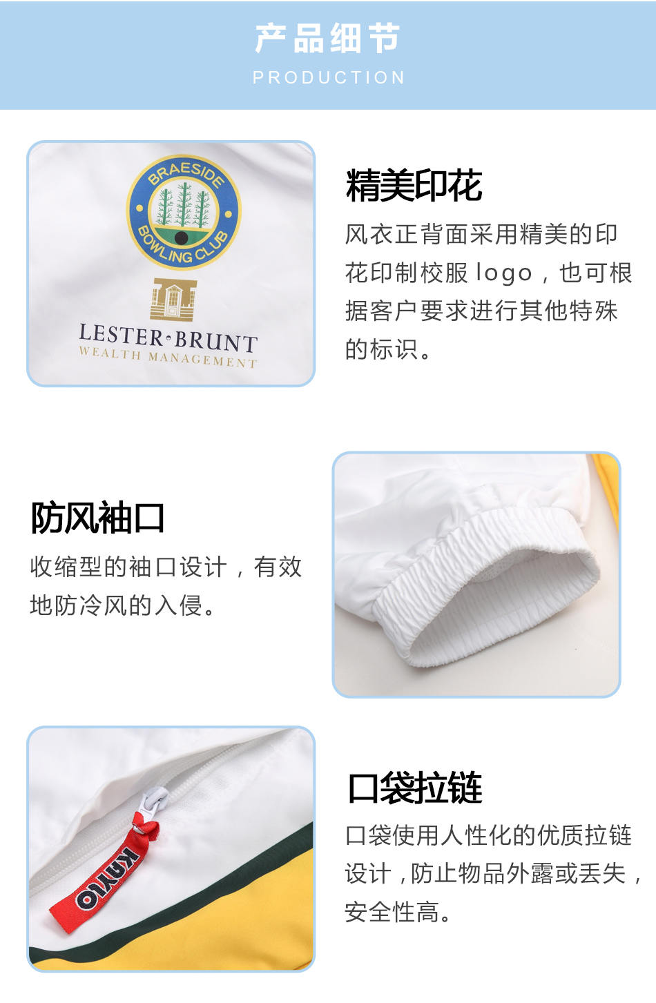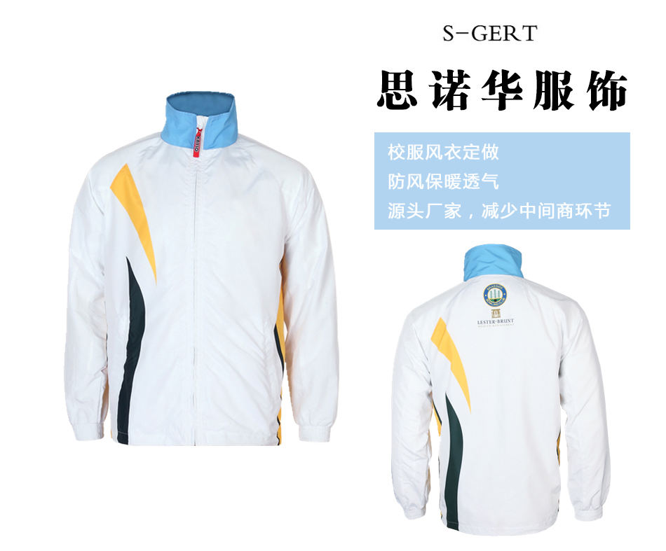 精美印花:風(fēng)衣正背面采用精美的印花印制校服logo,也可根據(jù)客戶的需求進行校服風(fēng)衣定制其特殊的標(biāo)識。