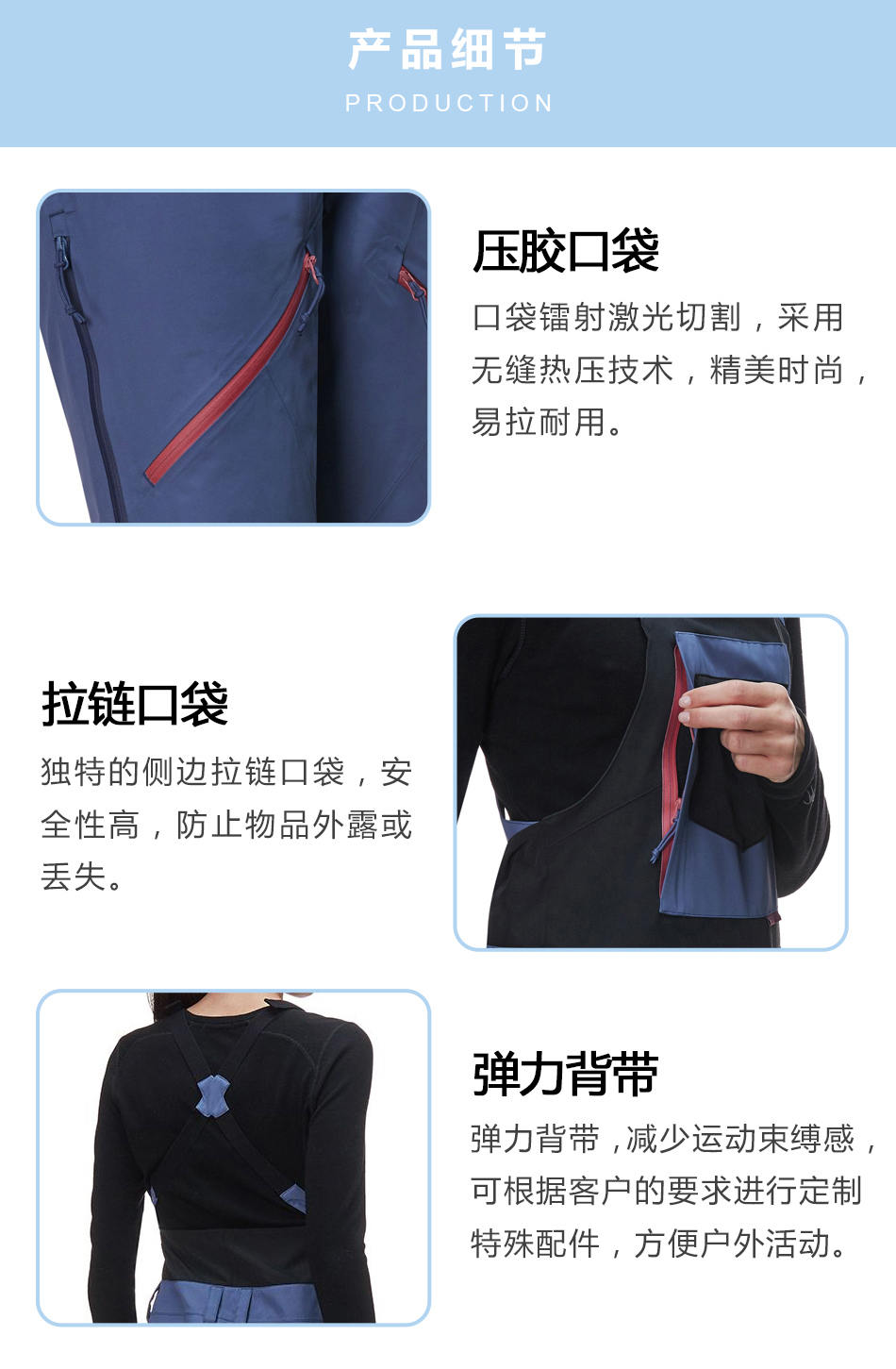 彈力背帶:彈力背帶,減少運動束縛感,可根據(jù)客戶的要求進行定制特殊配件,方便戶外活動。